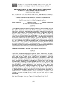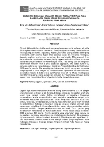 Erna, Lilis Sofianti Gea and Indra, Wahyuni Hutapea and Robin, Ferdiansyah Sitopu (2024) Hubungan dukungan keluarga dengan tingkat spiritual pada pasien gagal ginjal kronik di Ruang Hemodialisa RSU Royal Prima Medan. MAHESA: Malahayati Health Student Journal, 4 (8): 36. pp. 3537-3550. ISSN 2746-198X