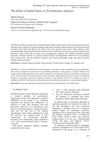 Martin, Wijaya and Delaneira, Princess Seourin and Bondan, Widi Anggoro and Paulus, Pramono Rahardjo (2022) The effect of initial stress to 3D settlement analysis. In: Proceeding 26th Annual National Conference on Geotechnical Engineering, 8-9 November 2022, Jakarta.