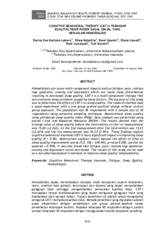 Danny, Des Kartyko Lakoro and Dhea, Natashia and Dewi, Gayatri and Diana, Irawati and Wati, Jumaiyah and Tuti, Nuraini (2024) Cognitive Behavioral Therapy (CBT-I) terhadap kualitas tidur pasien gagal ginjal yang menjalani hemodialisis. MAHESA: Malahayati Health Student Journal, 4 (8): 37. pp. 3551-3561. ISSN 2746-198X