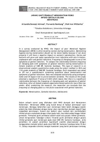Arisandie, Derezqi Achmad and Purwanto, Bambang and Diah, Ivon Wittiarika (2024) Jarang ganti pembalut meningkatkan risiko infeksi gentalia selama menstruasi. MAHESA: Malahayati Health Student Journal, 4 (8): 39. pp. 3570-3580. ISSN 2746-198X