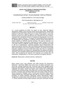 Dalam sebuah survei yang dilakukan oleh WHO dampak dari Manajemen Kebersihan Menstruasi (MKM) yang buruk kerap di hadapi perempuan saat menstruasi. Menjaga kebersihan saat menstruasi tidak boleh dianggap sepele sebab jika tidak dilakukan dengan benar akan memberikan dampak negatif bagi repsoduksi perempuan. Kuman dan bakteri akan tumbuh dan menimbulkan infeksi saluran reproduksi dengan iritasi pada kulit, bau tidak sedap hingga infeksi genetalia. Frekuensi ganti pembalut adalah salah satu gejala infeksi genetalia. untuk menganalisis hubungan antara freuensi ganti pembalut dengan gejala infeksi genatalia saat menstruasi pada siswi SMK DR. Soetomo Surabaya. jenis penelitian ini adalah penelitian kuantitatif analitik observasional dengan menggunakan metode kohort pada siswi SMK DR. Soetomo Surabaya kelas 10 dan 11. Setiap responden diminta mengisi kuesioner yang berisi pertanyaan tentang menstruasi dan gejala infeksi genetalia. Data di analisis secara statistiK menggunakan tabel kontigensi dan uji Chi Square untuk membuktikan antar variabel. Hasil dari penelitian ini diperoleh nilai signifikan P- Value sebesar 0,024 yang artinya terdapat hubungan yang bermakna antara frekuensi ganti pembalut dengan gejala infeksi genetalia, setelah semua siswi mengalami menstruasi lebih dari dua minggu. Setelah melakukan penelitian, maka peniliti dapat menyimpulkan bahwa frekuensi ganti pembalut merupakan faktor resiko yang berhubungan dengan gejala infeksi genetalia saat menstruasi.