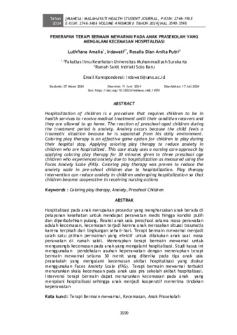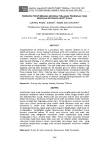 Luthfiana, Amalia and Irdawati, Irdawati and Rosalia, Dian Arsita Putri and UNSPECIFIED (2024) Penerapan terapi bermain mewarnai pada anak prasekolah yang mengalami kecemasan hospitalisasi. MAHESA: Malahayati Health Student Journal, 4 (8): 41. pp. 3590-3598. ISSN 2746-198X