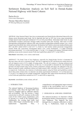 Paulus, Kevin and Thomas, Marcellino Santoso (2022) Settlement reduction analysis on soft soil in Demak-Kudus National Highway with stone column. In: Proceeding 26th Annual National Conference on Geotechnical Engineering, 8-9 November 2022, Jakarta.