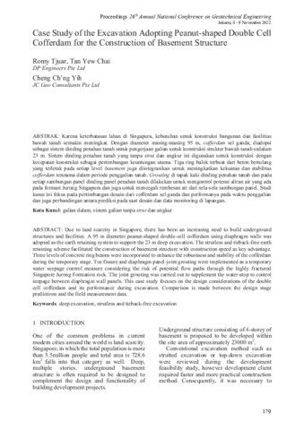 Romy, Tjuar and Tan, Yew Chai and Cheng, Ch’ng Yih (2022) Case study of the excavation adopting peanut-shaped double cell cofferdam for the construction of basement structure. In: Proceeding 26th Annual National Conference on Geotechnical Engineering, 8-9 November 2022, Jakarta.