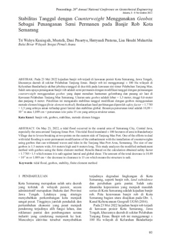 Tri, Wahyu Kuningsih and Mustafa, Mustafa and Dani, Prasetyo and Herryandi, Pratama and Lisa, Hendri Muhartika (2022) Stabilitas tanggul dengan counterweight menggunakan geobox sebagai penanganan semi permanen pada banjir rob Kota Semarang. In: Proceeding 26th Annual National Conference on Geotechnical Engineering, 8-9 November 2022, Jakarta.