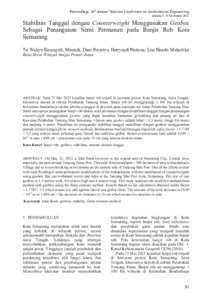 Pada 23 Mei 2022 kejadian banjir rob terjadi di kawasan pesisir Kota Semarang, Jawa Tengah,khususnya daerah di sekitar Pelabuhan Tanjung Emas. Banjir rob ini menggenangi ± 100 Ha wilayah di Kelurahan Bandarharjo akibat jebolnya tanggul di dua titik pada kawasan sisi timur Pelabuhan Tanjung Mas.Salah satu upaya penanganan banjir rob adalah semi permanen dengan modifikasi tanggul dengan pemasangan counterweight menggunakan geobox yang dapat menahan hantaman gelombang dan pasang air laut di Kawasan Pelabuhan Tanjung Mas Semarang. Ukuran satu geobox adalah lebar = 1,5 meter, tinggi 0,6-meter dan panjang 6 meter. Penelitian ini menganalis stabilitas tanggul modifikasi dengan geobox menggunakan metode elemen hingga (finite element method). Berdasarkan hasil perhitungan diperoleh safety factor = 1.7785 > 1,5 yang artinya aman terhadap geser lateral dan stabilitas global. Besarnya penurunan total adalah 10,89 × 10ˉ³ atau 1,089 cm < penurunan izin yaitu 15 cm yang artinya struktur aman.