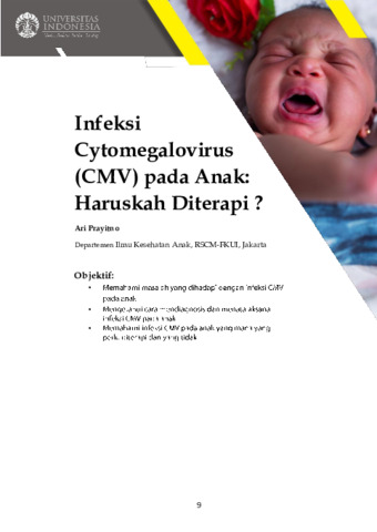 Ari, Prayitno (2022) Infeksi cytomegalovirus (CMV) pada anak: haruskah diterapi ? In: Prosiding Simposium LXXVIII Awareness of Facing Infectious and Non-Infectious Diseases in Pandemic Transition Era, 18 Juli 2022, Jakarta.