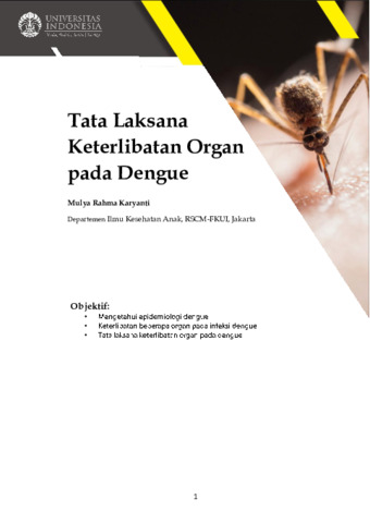 Penyebaran infeksi virus dengue dari daerah endemis ke daerah non-endemis merupakan masalah kesehatan di dunia. Manifestasi gejala infeksi dengue dapat terjadi mulai dari yang asimtomatik sampai gangguan pendarahan berat yang libatkan multiorgan. Keterlibatan organ hati, ginjal, susunan saraf pusat, jantung dan lain-lain mulai dilaporkan. Diagnosis dini dan tata laksana suportif yang tepat dapat mencegah terjadinya kematian.