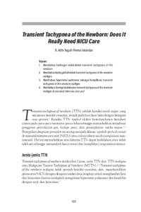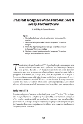 Transient tachypnea of newborn (TTN) adalah kondisi sesak napas yang umumnya bersifat swasirna, terjadi pada bayi baru lahir dengan beragam usia gestasi.Kondisi TTN timbul akibat keterlambatan bersihan cairan pada paru-paru neonatus pasca-lahir sehingga menyebabkan terjadinya gangguan pertukaran gas, kolaps paru, dan peningkatan usaha napas.Penegakan diagnosa penyakit ini sering menjadi dilema apakah perlu di rawat di neonatal intensive care unit (NICU) atau cukup observasi di ruang rawat nonintensif. Hal ini menyebabkan tata laksanaTTNdapatberlebihan atautidakadekuat sehingga menambah biaya rawat dan komplikasi yangmenyertainya.
