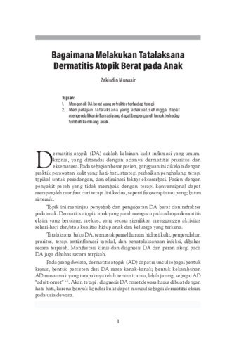 Dermatitis atopik (DA) adalah kelainan kulit inflamasi yang umum, kronis, yang ditandai dengan adanya dermatitis pruritus daneksematosa. Pada sebagian besar pasien, gangguan ini dikelola dengan praktik perawatan kulit yang hati-hati, strategi perbaikan penghalang, terapi topikal untuk peradangan, dan eliminasi faktor eksaserbasi. Pasien dengan penyakit parah yang tidak membaik dengan terapi konvensional dapat memperoleh manfaat dari terapi lini kedua, seperti fototerapi atau pengobatan sistemik.