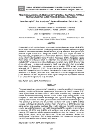 Iwan, Samsugito and Dwi, Nopriyanto and Syukma, Rhamadhani Faizal Nur and Siti, Riyani (2024) Pemberdayaan guru menerapkan SELF (Spritual Emotional Freedom Technique) untuk murid perokok di SMKN 6 Samarinda. Jurnal Kreativitas Pengabdian kepada Masyarakat, 7 (8): 3. pp. 3304-3313. ISSN 2615-0921