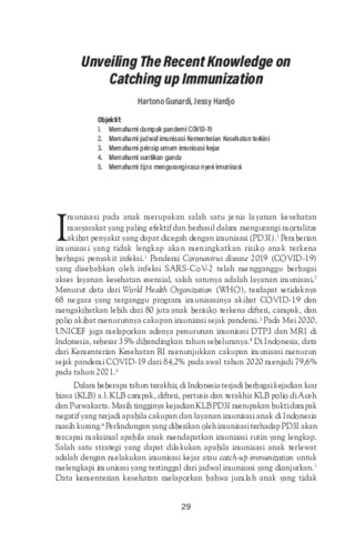 munisasi pada anak merupakan salah satu jenis layanan kesehatanmasyarakat yang paling efektif dan berhasil dalam mengurangi mortalitas akibat penyakit yang dapat dicegah dengan imunisasi (PD3I). Pemberian imunisasi yang tidak lengkap akan meningkatkan risiko anak terkena berbagai penyakit infeksi. Pandemi Coronavirus disease 2019 (COVID-19) yang disebabkan oleh infeksi SARS-CoV-2 telah mengganggu berbagai akses layanan kesehatan esensial, salah satunya adalah layanan imunisasi. Menurut data dari World Health Organization (WHO), terdapat setidaknya 68 negara yang terganggu program imunisasinya akibat COVID-19 dan mengakibatkan lebih dari 80 juta anak berisiko terkena difteri, campak, dan polio akibat menurunnya cakupan imunisasi sejak pandemi. Pada Mei 2020, UNICEF juga melaporkan adanya penurunan imunisasi DTP3 dan MR1 di Indonesia, sebesar 35% dibandingkan tahun sebelumnya. Di Indonesia, data dari Kementerian Kesehatan RI menunjukkan cakupan imunisasi menurun sejak pandemi COVID-19 dari 84,2% pada awal tahun 2020 menjadi 79,6% pada tahun 2021.