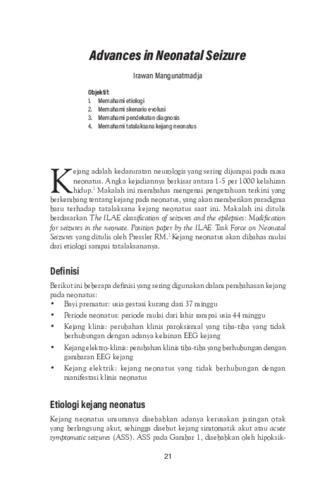 ejang adalah kedaruratan neurologis yang sering dijumpai pada masa neonatus. Angka kejadiannya berkisar antara 1-5 per 1000 kelahiran hidup. Makalah ini membahas mengenai pengetahuan terkini yangberkembang tentang kejang pada neonatus, yang akan memberikan paradigma baru terhadap tatalaksana kejang neonatus saat ini. Makalah ini ditulis berdasarkan The ILAE classification of seizures and the epilepsies: Modification for seizures in the neonate. Position paper by the ILAE Task Force on Neonatal Seizures yang ditulis oleh Pressler RM. Kejang neonatus akan dibahas mulai dari etiologi sampai tatalaksananya.