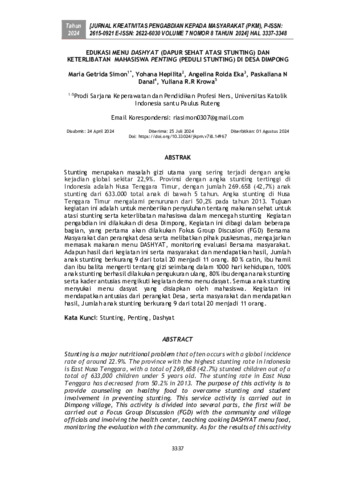 Maria, Getrida Simon and Yohana, Hepilita and Angelina, Roida Eka and Paskaliana, N Danal and Yuliana, R.R Krowa (2024) Edukasi menu dashyat (dapur sehat atasi stunting) dan keterlibatan mahasiswa penting (peduli stunting) di Desa Dimpong. Jurnal Kreativitas Pengabdian kepada Masyarakat, 7 (8): 6. pp. 3337-3348. ISSN 2615-0921