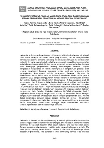 Nadya, Karlina Megananda and Bela, Novita Amaris Susanto and Novi, Indah Aderita and Tutik, Rahayuningsih and Tutik, Yuliyanti and Ratna, Setiyaningsih and Deden, Dermawan (2024) Sosialisasi SIGEMPAR (Simulasi Manajemen Gempa Bumi dan Kebakaran) sebagai peningkatan pengetahuan mitigasi bencana di Sukoharjo. Jurnal Kreativitas Pengabdian kepada Masyarakat, 7 (8): 7. pp. 3349-3362. ISSN 2615-0921