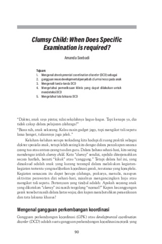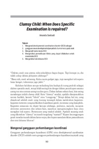 “Dokter, anak saya pintar, nilai sekolahnya bagus-bagus. Tapi kenapa ya, dia tidak cakap dalam pelajaran olahraga?” “Biasa nih, anak sekarang. Kalau main gadget jago, tapi mengikat tali sepatu lama banget, tulisannya juga jelek.” Keluhan-keluhan serupa terkadang kita hadapi di ruang praktik sebagai dokter spesialis anak, tetapi lebih sering kita dengar dalam percakapan sesama orang tua atau antara orang tua dan guru. Dalam bahasa sehari-hari, kita sering mendengar istilah clumsy child. Kata “clumsy” sendiri, apabila diterjemahkan secara harfiah, berarti “kikuk” atau “canggung.” Tetapi dalam hal ini, yang dimaksud adalah anak yang kurang terampil dalam melakukan kegiatan-kegiatan tertentu yang melibatkan koordinasi gerak, terutama yang kompleks.Kegiatan semacam itu dapat berupa olahraga, prakarya, menulis, maupun aktivitas perawatan diri sehari-hari, misalnya mengancingkan baju atau mengikat tali sepatu. Pertanyaan yang timbul adalah: Apakah seorang anak yang dikatakan “clumsy” ini masih tergolong “normal?” Kapan kecanggungan gerak tersebut masih dalam batas wajar, dan kapan membutuhkan pemeriksaan dan tata laksana khusus?