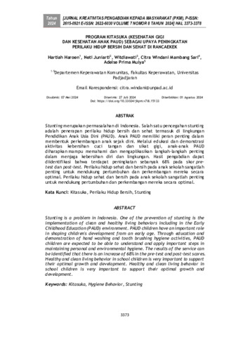 | Uncontrolled Keywords: | Kitasuka, Perilaku hidup bersih, Stunting, Hygiene, Human behavior, Dental health services, Dental care, Preschool education, Child care |
