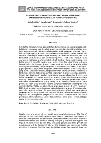 Udin, Rosidin and Hendrawati, Hendrawati and Iceu, Amira and Sukma, Senjaya (2024) Pendidikan kesehatan tentang pentingnya kebersihan sanitasi lingkungan dalam pencegahan stunting. Jurnal Kreativitas Pengabdian kepada Masyarakat, 7 (8): 13. pp. 3413-3425. ISSN 2615-0921