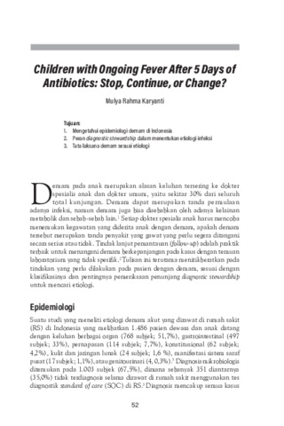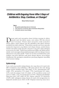 Demam pada anak merupakan alasan keluhan tersering ke dokter spesialis anak dan dokter umum, yaitu sekitar 30% dari seluruhtotal kunjungan. Demam dapat merupakan tanda permulaan adanya infeksi, namun demam juga bisa disebabkan oleh adanya kelainan metabolik dan sebab-sebab lain. Setiap dokter spesialis anak harus mencoba menemukan kegawatan yang diderita anak dengan demam, apakah demam tersebut merupakan tanda penyakit yang gawat yang perlu segera ditangani secara serius atau tidak. Tindak lanjut pemantauan (follow-up) adalah praktik terbaik untuk menangani demam berkepanjangan pada kasus dengan temuan laboratorium yang tidak spesifik. Tulisan ini terutama menitikberatkan pada tindakan yang perlu dilakukan pada pasien dengan demam, sesuai dengan klasifikasinya dan pentingnya pemeriksaan penunjang diagnostic stewardship untuk mencari etiologi.