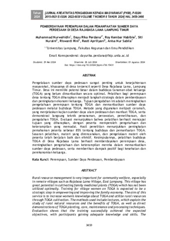 Muhammad, Nurwahidin and Dayu, Rika Perdana and Roy, Kembar Habibie and Siti, Nuraini and Riswanti, Rini and Resti, Apriliyani and Anisa, Nur Sabila (2024) Pemberdayaan perempuan dalam pemanfaatan sumber daya perdesaan di Desa Rajabasa Lama Lampung Timur. Jurnal Kreativitas Pengabdian kepada Masyarakat, 7 (8): 17. pp. 3459-3466. ISSN 2615-0921