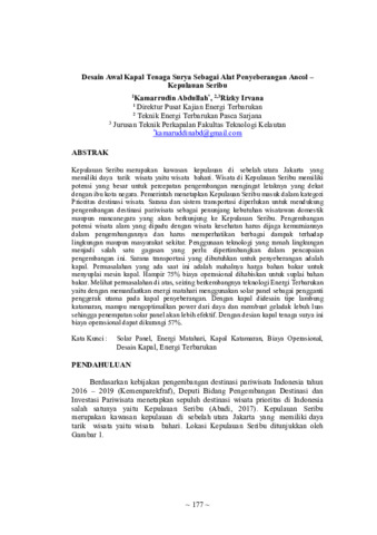 Kepulauan Seribu merupakan kawasan kepulauan di sebelah utara Jakarta yang memiliki daya tarik wisata yaitu wisata bahari. Wisata di Kepulauan Seribu memiliki potensi yang besar untuk percepatan pengembangan mengingat letaknya yang dekat dengan ibu kota negara. Pemerintah menetapkan Kepulauan Seribu masuk dalam kategori Prioritas destinasi wisata. Sarana dan sistem transportasi diperlukan untuk mendukung pengembangan destinasi pariwisata sebagai penunjang kebutuhan wisatawan domestik maupun mancanegara yang akan berkunjung ke Kepulauan Seribu. Pengembangan potensi wisata alam yang dipadu dengan wisata kesehatan harus dijaga kemurniannya dalam pengembangannya dan harus memperhatikan berbagai dampak terhadap lingkungan maupun masyarakat sekitar. Penggunaan teknologi yang ramah lingkungan menjadi salah satu gagasan yang perlu dipertimbangkan dalam pencapaian pengembangan ini. Sarana transportasi yang dibutuhkan untuk penyeberangan adalah kapal. Permasalahan yang ada saat ini adalah mahalnya harga bahan bakar untuk menyuplai mesin kapal. Hampir 75% biaya operasional dihabiskan untuk suplai bahan bakar. Melihat permasalahan di atas, seiring berkembangnya teknologi Energi Terbarukan yaitu dengan memanfaatkan energi matahari menggunakan solar panel sebagai pengganti penggerak utama pada kapal penyeberangan. Dengan kapal didesain tipe lambung katamaran, mampu mengoptimalkan power dari daya dan membuat geladak lebuh luas sehingga penempatan solar panel akan lebih efektif. Dengan desian kapal tenaga surya ini biaya operasional dapat dikurangi 57%.