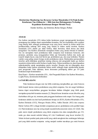 Gas karbon monoksida (CO) dalam kabin kendaraan sangat mempengaruhi kesehatan penumpang dan bahkan dapat menimbulkan kematian. Hal ini disebabkan oleh ventilasi yang kurang baik sehingga pembuangan asap yang bocor masuk ke dalam mobil dan perlahan-lahan terhirup oleh orang yang berada di dalam mobil tersebut. Karbon monoksida (CO) adalah gas tidak berbau, tidak berwarna, tidak berasa dan tidak mengiritasi. Gas Karbon monoksida merupakan bahan yang umum ditemui di industri.Gas ini merupakan hasil pembakaran tidak sempurna dari kendaraan bermotor, alat pemanas, peralatan yang menggunakan bahan api berasaskan karbon dan nyala api (seperti tungku kayu), asap dari kereta api, pembakaran gas, dan asap tembakau. Namun sumber yang paling umum berupa residu pembakaran mesin. Berdasarkan permasalahan tersebut, perlu dilakukan penelitian tentang rekayasa alat pengendali kadar gas karbon monoksisa dalam kabin mobil berbasis logika fuzzy. Dalam penelitian ini akan digunakan mikrokontroller untuk menjalankan proses tersebut. Dengan alat ini diharapkan akan didapatkan kadar karbon monoksida dalam mobil sehingga dapat memberitahu kepada para pengemudi. Pada akhirnya, kasus keracunan penumpang akibat gas CO padakendaraan dapat diminimalisir.