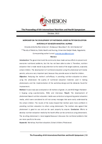 Amanda, Jelita Eka Riani Johanni and Mubasysyir, Hasanbasri and B., J. Istiti Kandarina (2022) Workshop on the development of photonovel-based nutrition education materials at SD Negeri Naikoten 1 Kupang. In: The Proceeding of 6th International Nutrition and Health Symposium, 30 Oktober 2022, Yogyakarta.