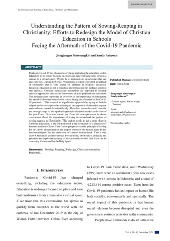 Jungjungan, Simorangkir and Sandy, Ariawan (2021) Understanding the pattern of sowing-reaping in Christianity: Efforts to redesign the model of Christian education in schools facing the aftermath of the Covid-19 pandemic. The International Journal of Education, Theology, and Humanities, 1 (1): 1. pp. 1-7. ISSN 3031-5077