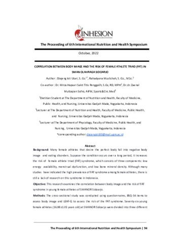 Diajeng, Isti Utari and Rahadyana, Muslichah and Mirza, Hapsari Sakti Titis Penggalih and Zaenal, Muttaqien Sofro (2022) Correlation between body image and the risk of Female Athlete Triad (FAT) in SMAN Olahraga Sidoarjo. In: The Proceeding of 6th International Nutrition and Health Symposium, 30 Oktober 2022, Yogyakarta.