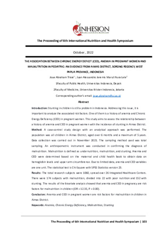 Joue, Abraham Trixie and Juan, Alessandro Jeremis Maruli Nura Lele (2022) The association between Chronic Energy Deficit (CED), anemia in pregnant women and malnutrition in pediatric: an evidence from Aimas District, Sorong Regency, West Papua Province, Indonesia. In: The Proceeding of 6th International Nutrition and Health Symposium, 30 Oktober 2022, Yogyakarta.