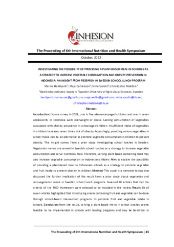 Marina, Hardiyanti and Maja, Danielsson and Niina, Sundin and Christopher, Malefors (2022) Investigating the possibility of providing a plant-based meal in schools as a strategy to increase vegetable consumption and obesity prevention in Indonesia: an insight from research in Swedish school lunch program. In: The Proceeding of 6th International Nutrition and Health Symposium, 30 Oktober 2022, Yogyakarta.