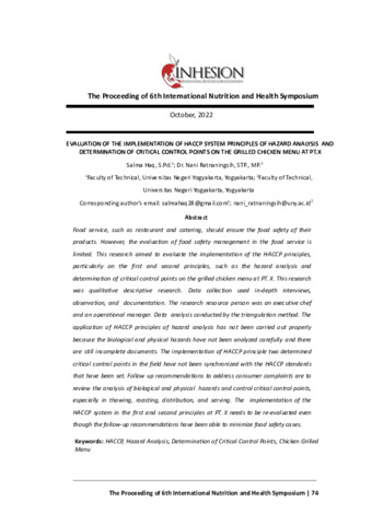 Salma, Haq and Nani, Ratnaningsih (2022) Evaluation of the implementation of HACCP system principles of hazard analysis and determination of critical control points on the grilled chicken menu at PT.X. In: The Proceeding of 6th International Nutrition and Health Symposium, 31 Oktober 2022, Yogyakarta.