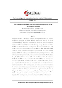Yoseph, Leonardo Samodra and Ying, Chih Chuang (2022) Effects of parental economic level trajectories on children’s BMI z-score trajectories in Indonesia. In: The Proceeding of 6th International Nutrition and Health Symposium, 31 Oktober 2022, Yogyakarta.