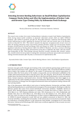 Budi, Wibowo Halim and Maria, Ulpah (2023) Detecting investor herding behaviours on small medium capitalization company stocks before and after the implementation of broker code and investor type closing policy by Indonesian stock exchange. In: Proceedings International Conference on Business and Management Research (ICBMR), 12-13 Oktober 2022, Depok.