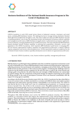 Deded, Chandra and Yuliasman, Yuliasman and Tarombo, P. Situmorang (2023) Business resilience of the national health insurance program in the Covid-19 pandemic era. In: Proceedings International Conference on Business and Management Research (ICBMR), 12-13 Oktober 2022, Depok.
