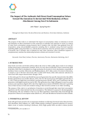 Julio, Trijaya and Agung, Nugroho (2023) The impact of the authentic Bali street food consumption values toward the intention to revisit Bali with mediation of place attachment among Gen Z in Indonesia. In: Proceedings International Conference on Business and Management Research (ICBMR), 12-13 Oktober 2022, Depok.