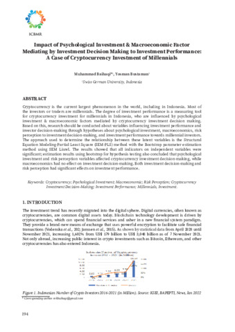 Muhammad, Baihaqi and Yosman, Bustaman (2023) Impact of psychological investment & macroeconomic factor mediating by investment decision making to investment performance: a case of cryptocurrency investment of millennials. In: Proceedings International Conference on Business and Management Research (ICBMR), 12-13 Oktober 2022, Depok.
