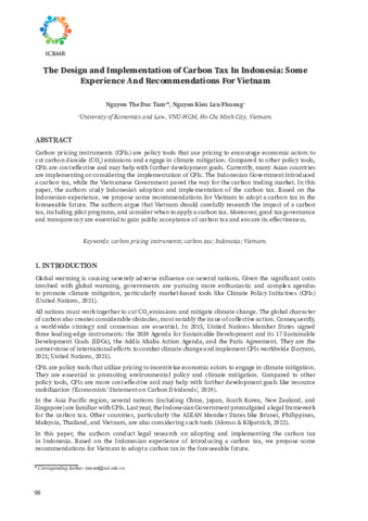 Nguyen, The Duc Tam and Nguyen, Kieu Lan Phuong (2023) The design and implementation of carbon tax in Indonesia: some experience and recommendations for Vietnam. In: Proceedings International Conference on Business and Management Research (ICBMR), 12-13 Oktober 2022, Depok.