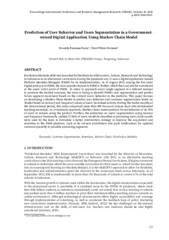 Novaldy, Pratama Putra and Putri, Wikie Novianti (2023) Prediction of user behavior and users segmentation in a government-owned digital application using Markov Chain model. In: Proceedings International Conference on Business and Management Research (ICBMR), 12-13 Oktober 2022, Depok.