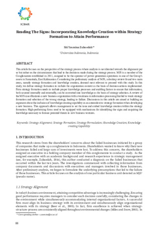 Siti, Yasmina Zubaedah (2023) Reading the signs: incorporating knowledge creation within strategy formation to attain performance. In: Proceedings International Conference on Business and Management Research (ICBMR), 12-13 Oktober 2022, Depok.