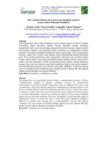 Tanzilul, Authar and Warul, Walidin and Syabuddin, Syabuddin, Syabuddin, Syabuddin and Salami, Mahmud (2024) Pola komunikasi islam dalam pembelajaran (suatu analisis psikologi pendidikan). Kajian Pendidikan, Sosial, dan Keagamaan (ANATESA), 14 (2): 1. pp. 1-12. ISSN 2302-8327