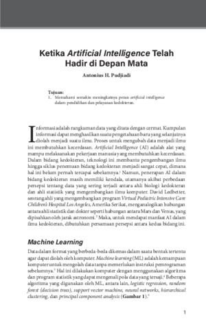 Informasi adalah rangkuman data yang ditata dengan cermat. Kumpulan informasi dapat menghasilkan suatu pengetahuan baru yang selanjutnya diolah menjadi suatu ilmu. Proses untuk mengubah data menjadi ilmu ini membutuhkan kecerdasan. Artificial Intelligence (AI) adalah alat yang mampu melaksanakan pekerjaan manusia yang membutuhkan kecerdasan. Dalam bidang kedokteran, teknologi ini membantu pengembangan ilmu hingga siklus penemuan bidang kedokteran menjadi sangat cepat, dimana hal ini belum pernah tercapai sebelumnya. Namun, penerapan AI dalambidang kedokteran masih memiliki kendala, utamanya akibat perbedaan persepsi tentang data yang sering terjadi antara ahli biologi kedokteran dan ahli statistik yang mengembangkan ilmu komputer. David Ledbetter, seorang ahli yang mengembangkan program Virtual Pediatric Intensive Care Children’s Hospital Los Angeles, Amerika Serikat, menganalogikan hubungan antara ahli statistik dan dokter seperti hubungan antara Mars dan Venus, yang dipisahkan oleh jarak astronomi.Maka, untuk mendapat manfaat AI dalam ilmu kedokteran, dibutuhkan persamaan persepsi antara kedua bidang ini.