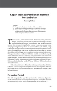 Tujuan utama pemberian Growth Hormone (GH) pada anak dengan perawakan pendek (aPP) adalah untuk meningkatkan dan mengembalikan kecepatan pertumbuhan agar anak bertumbuh normal dan mencapai tinggi badan normal pada usia dewasa sesuai dengan potensi genetiknya. Pada era pra-rekombinan GH (rhGH), terapi GH dengan menggunakan GH kadaver, persediaannya sangat terbatas dan hanya terindikasi untuk GHD berat. Melalui rekayasa genetika GH, berhasil diproduksi rhGH sehingga secara teoritis persediaan menjadi tak terbatas. Walaupun demikian, pemberian GH tidak mutlak dapat diberikan pada semua aPP karena salah satu alasannya yang nyata adalah tidak semua aPP adalah patologis. Hingga saat ini sebagian besar konsensus mengenai terapi GH pada aPP, selain tentunya untuk penderita dengan defisiensi GH justru lebih banyak diindikasikan untuk aPP tanpa defisiensi GH (misal, sindrom Turner, Noonan).