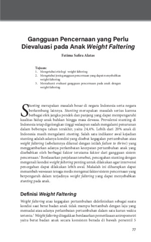 Sunting merupakan masalah besar di negara Indonesia serta negara berkembang lainnya. Stunting merupakan masalah serius karena berbagai efek jangka pendek dan panjang yang dapat mempengaruhi kualitas hidup anak bahkan hingga masa dewasa. Prevalensi stunting di Indonesia tetap digolongkan tinggi walaupun sudah mengalami penurunan dalam beberapa tahun terakhir, yaitu 24,4%. Lebih dari 20% anak di Indonesia masih mengalami stunting. Salah satu indikator awal kejadian stunting adalah adanya kondisi yang disebut kegagalan pertumbuhan atau weight faltering (sebelumnya dikenal dengan istilah failure to thrive) yang menggambarkan adanya perlambatan kecepatan pertumbuhan anak yang disebabkan oleh berbagai faktor terutama faktor dari gangguan sistem pencernaan. Berdasarkan penjelasan tersebut, pencegahan stunting dengan mengenali kondisi weight faltering penting untuk dilakukan agar intervensi pencegahan dapat dilakukan lebih awal. Makalah ini diharapkan dapat menambah wawasan tenaga medis mengenai faktor sistem pencernaan yang berpengaruh dalam terjadinya weight faltering yang dapat menyebabkan stunting pada anak.