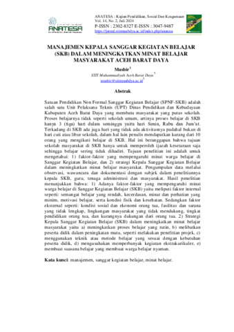 Musbir, Musbir (2024) Manajemen Kepala Sanggar Kegiatan Belajar (SKB) dalam meningkatkan belajar masyarakat Aceh Barat Daya. Jurnal Kajian Pendidikan, Sosial, dan Keagamaan (ANATESA), 14 (2): 4. pp. 34-42. ISSN 2302-8327