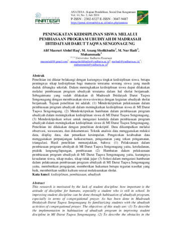 Alif, Masruri Abdul Haq and M. Anang, Sholikhudin and M. Nur, Hadi and Muhammada, Muhammada (2024) Peningkatan kedisiplinan siswa melalui pembiasaan program ubudiyah di Madrasah Ibtidaiyah Darut Taqwa Sengonagung. Jurnal Kajian Pendidikan, Sosial, dan Keagamaan (ANATESA), 14 (2): 5. pp. 43-59. ISSN 2302-8327