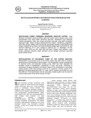 REVITALISASI POMPA PENDINGIN SEKUNDER REAKTOR KARTINI. Telah dilakukan revitalisasi pompa pendingin sekunder reaktor Kartini dengan tujuan untuk memperbaiki unjuk kerja sistem pendingin sekunder. Revitalisasi yang dilakukan meliputi penggantian motor dan pompa pendingin sekunder yang telah mengalami degradasi fungsi. Adapun tahapan pelaksanaannya meliputi : Identifikasi, penggantian motor dan pompa, setting motor dan pompa, pembuatan konektor input/output pompa dengan instalasi dan uji fungsi. Dari hasil revitalisasi didapat data arus start 60 A, arus nominal maksimum 34 A, suhu maksimum cashing 62,2°C, kebisingan 106 db,putaran motor 2830 rpm dan debit 890 liter/menit. Dengan hasil tersebut, maka pompa pendingin sekunder dapat berfungsi normal sebagai pendingin pemindah panas reaktor Kartini.