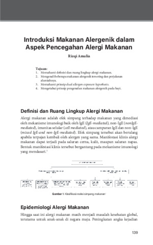 Alergi makanan adalah efek simpang terhadap makanan yang dimediasi oleh mekanisme imunologi baik oleh IgE (IgE-mediated), non-IgE (nonIgEmediated), imunitas selular (cellmediated), atau campuran IgE dan non-IgE (mixed IgE-and non-IgE-mediated). Efek simpang tersebut akan berulang apabila terpajan kembali oleh alergen yang sama. Manifestasi klinis alergi makanan dapat terjadi pada saluran cerna, kulit, maupun saluran napas. Bentuk manifestasi klinis tersebut bergantung pada mekanisme imunologi yang mendasari