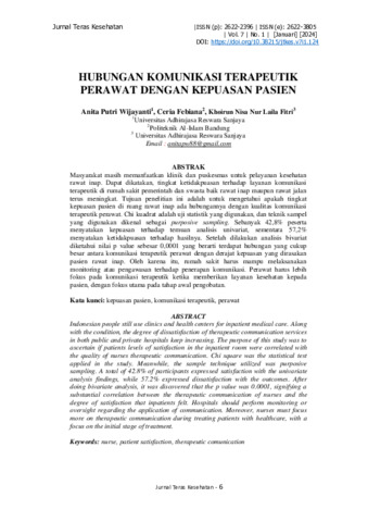Anita, Putri Wijayanti and Ceria, Febiana and Khoirun, Nisa Nur Laila Fitri (2024) Hubungan komunikasi terapeutik perawat dengan kepuasan pasien. Jurnal Teras Kesehatan, 7 (1): 2. pp. 6-10. ISSN 2622-2396
