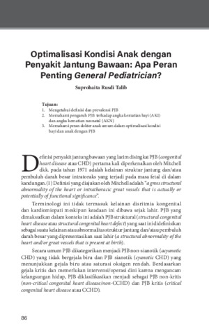 Definisi penyakit jantung bawaan yang lazim disingkat PJB (congenital heart disease atau CHD) pertama kali diperkenalkan oleh Mitchell dkk. pada tahun 1971 adalah kelainan struktur jantung dan/atau pembuluh darah besar intratoraks yang terjadi pada masa fetal di dalam kandungan.(1) Definisi yang diajukan oleh Mitchell adalah “a gross structural abnormality of the heart or intrathoracic great vessels that is actually or potentially of functional significance”.